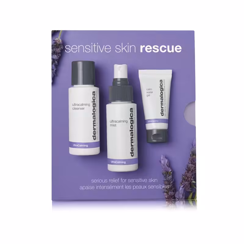 Dermalogica Sensitive Skin Rescue Set to minizestaw kosmetyków stworzonych specjalnie do cery wrażliwej i delikatnej. W praktycznym opakowaniu znajdują się 3 miniaturowe produkty doskonale odpowiadające na potrzeby skóry wrażliwej. Małe opakowania doskonale sprawdzą się w podróży. W skład zestawu wchodzą: – Żel oczyszczający do skóry wrażliwej Dermalogica UltraCalming Cleanser 50ml – Mgiełka kojąco-nawilżająca Dermalogica UltraCalming Mist 15ml – Lekki żel nawilżający do twarzy Dermalogica UltraCalming Calm Water Gel 15ml Żel Dermalogica UltraCalming Cleanser przeznaczony jest w szczególności do skóry wrażliwej. Jest on niezwykle delikatny i nie podrażnia skóry. Jego skład opiera się na składnikach, które oczyszczają dokładnie skórę, nie wpływając na stan jej bariery ochronnej. Zawiera on wyciąg z malin, który odpowiedzialny jest za procesy regenerujące skórę i mające działanie kojące. Wyciąg z owocu lawendy posiada właściwości antyseptyczne i dezynfekujące, a ekstrakt z zielonego ogórka ukoi i złagodzi wszelkie podrażnienia powstałe na Twojej skórze. Dzięki witaminie B5 skóra jest zabezpieczona przed wysuszeniem i uczuciem ściągnięcia. Mgiełka Dermalogica UltraCalming Mist pozwala zwalczyć wszelkie oznaki uwrażliwienia, zmniejsza zaczerwienienia, podrażnienia i pieczenie. Procesy odbudowy skóry są wspomagane, dzięki zawartości aktywnych składników. Dodatkowo mgiełka posiada właściwości łagodzące. Uczucie dyskomfortu zostaje wyeliminowane, a kondycja skóry jest poprawiona. Dermalogica UltraCalming Calm Water Gel to lekki żel nawilżający do twarzy. Kosmetyk posiada wyjątkowo delikatną i praktyczną formułę – odświeżającą, kojącą i pielęgnującą. Żelowa konsystencja przemienia się w ciekłą, by zaoferować cerze natychmiastowy zastrzyk nawadniających właściwości. Sekretem kosmetyku są składniki aktywne bardzo dobrze znane ze swoich silnych właściwości nawilżających. Sok aloesowy, kwas hialuronowy, gliceryna i ekstrakt z jabłka nawadniają różne warstwy skóry, a jednocześnie chronią przed zbyt szybką utratą wilgoci. Żel zabezpiecza także twarz przed czynnikami środowiskowymi.