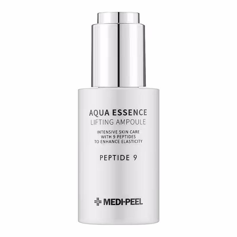 [MEDI-PEEL] Peptyd 9 Aqua Essence Ampułka Liftingująca, 50 ml Antyoksydacyjne serum liftingujące z peptydami Medi-Peel Peptide 9 Aqua Essence Lifting Ampoule ma szerokie działanie: poprawia cerę, delikatnie rozjaśnia niechciane przebarwienia i wyrównuje koloryt, zwiększa elastyczność, wzmacnia turgor, wygładza zmarszczki skóry i zmniejsza ich intensywność. Zawiera kompleks peptydowy, adenozynę, 7 rodzajów kwasu hialuronowego, glutation i koenzym Q10.