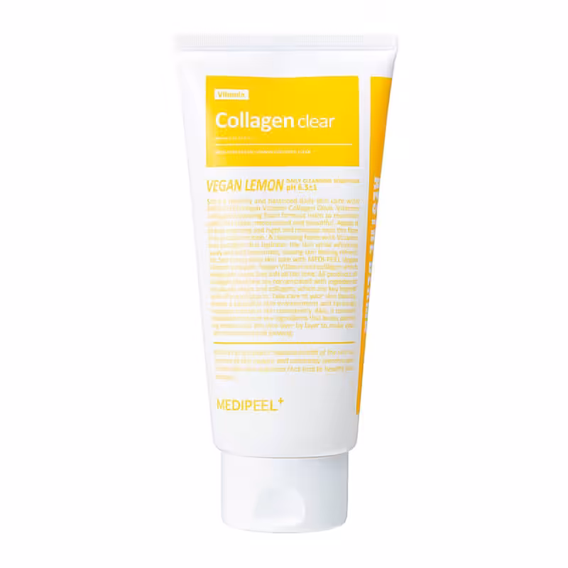 Rozświetlający żel-pianka z kolagenem i rokitnikiem Medi-Peel Vegan Vitamin Collagen Clear oczyszcza pory, usuwa zanieczyszczenia i nadmiar sebum, usuwa pozostałości makijażu, wyrównuje koloryt i zmniejsza widoczność przebarwień. Zawarte w składzie witaminy i kwasy delikatnie złuszczają warstwę rogową naskórka, zapobiegając zatykaniu porów i powstawaniu zaskórników oraz zwalczając matowość. Zawiera 24% hydrolat z rokitnika, kolagen wegański, nitsainamid, glutation, kwasy AHA i PHA, witaminy A, B1, B2, B5, B6, B7, B12, C, E i K, a także ekstrakty z cytryny, fig i rozmarynu. Wegańskie produkty z certyfikatem V-Label®. Poziom pH 6,5. Odpowiedni dla skóry normalnej, mieszanej i suchej.