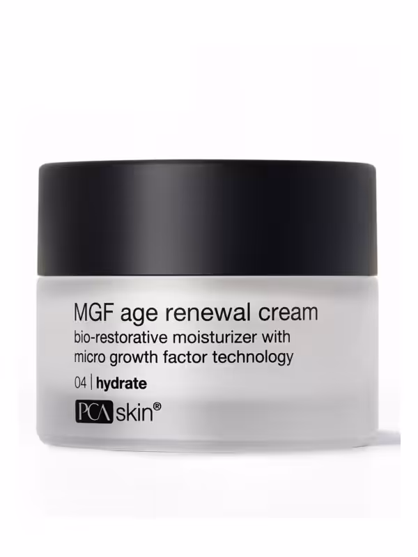 Po oczyszczeniu, tonizacji i nałożeniu odpowiedniego serum pielęgnacyjnego PCA SKIN, krem MGF Age Renewal